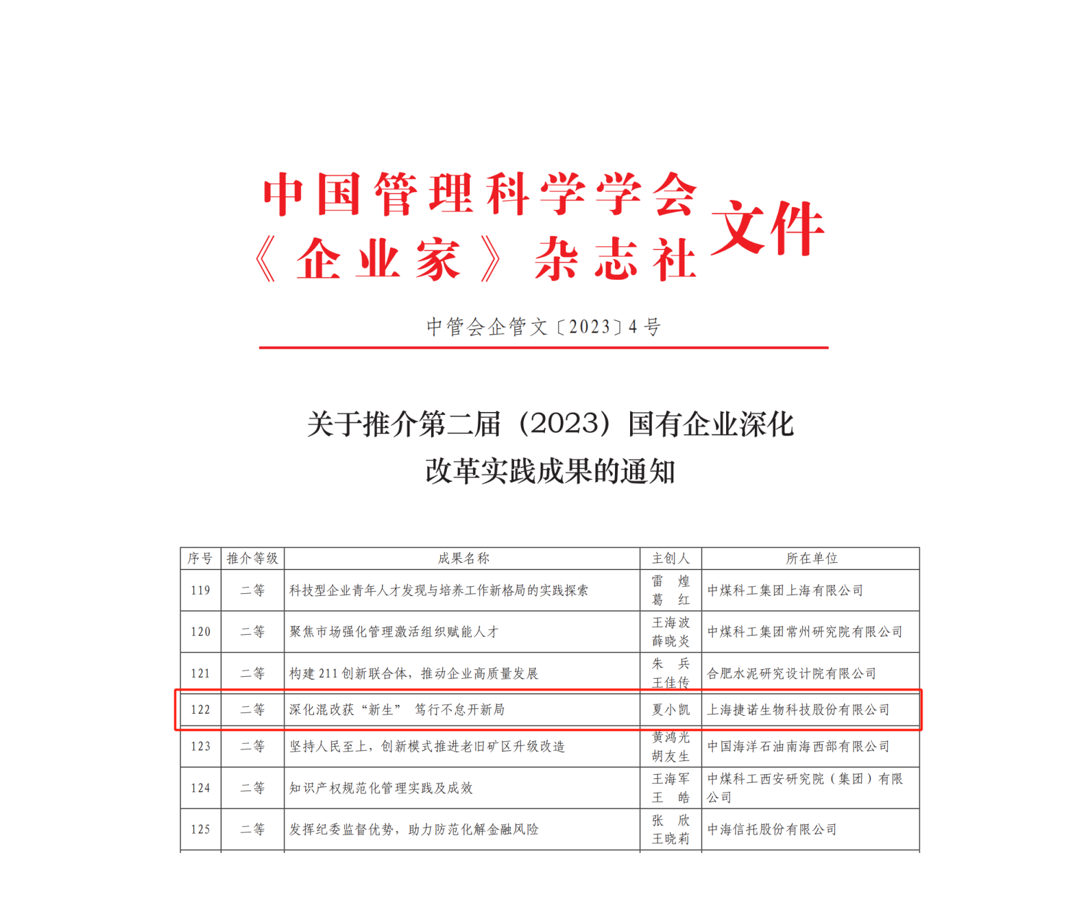 近日,,,中国管理科学学会和《企业家》杂志社联合发布了第二届(2023)国有企业深化改革实践成果推介名单,,,上海尊龙时凯生物科技股份有限公司(以下简称:尊龙时凯生物)上报的《深化混改获“新生”,,,笃行不怠开新局》获评二等成果。。