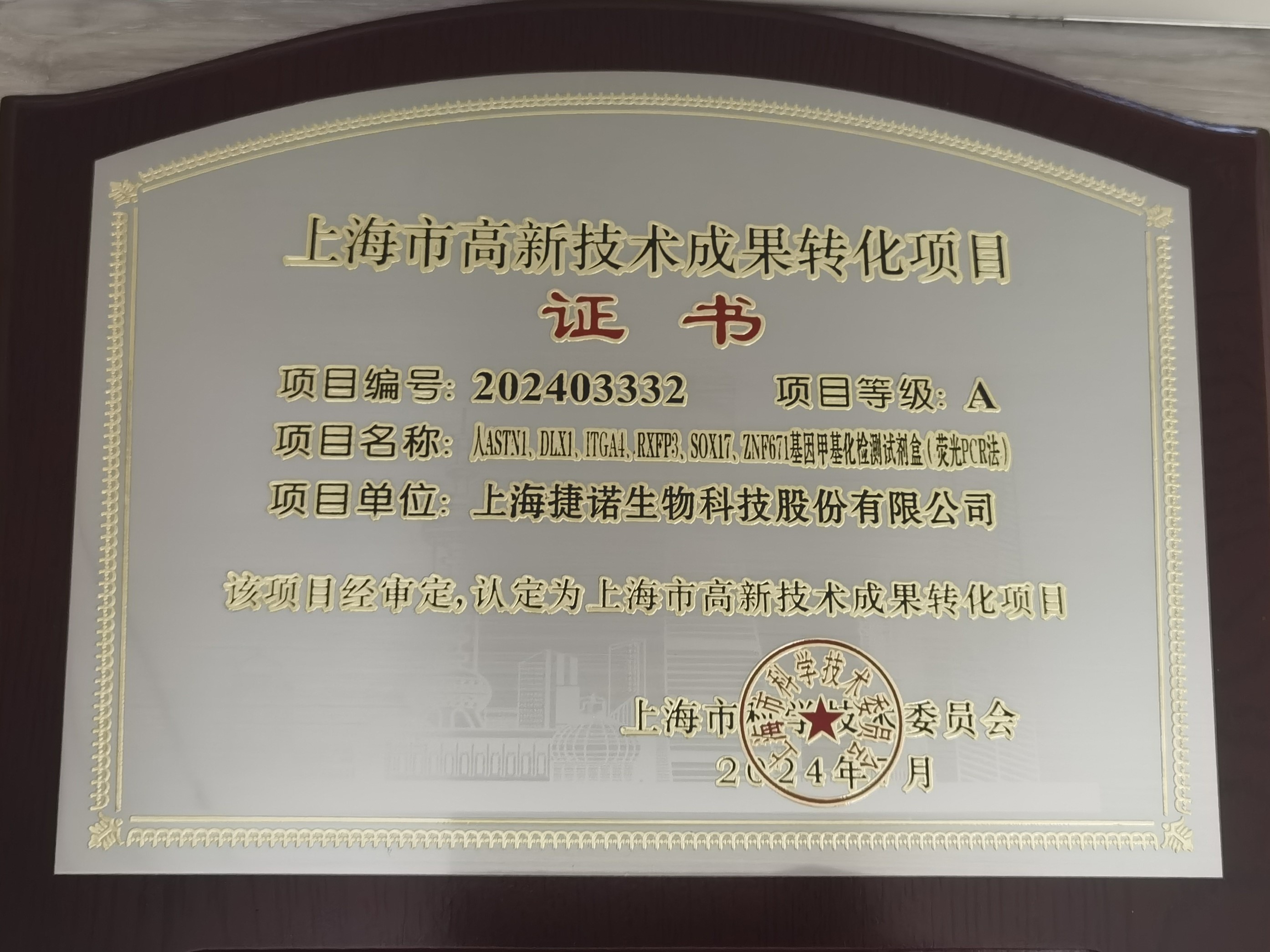 2024年第3批上海市高新技术成果转化项目名单公布,,尊龙时凯生物的宫安丽®(人ASTN1、、DLX1、、ITGA4、、、、RXFP3、、SOX17、、ZNF671基因甲基化检测试剂盒)被纳入项目名单。。